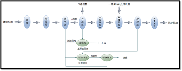 屠宰過程中產(chǎn)生大量的廢水,動物糞便、血液、動物內(nèi)臟雜物、畜毛、碎皮肉和油脂等有機(jī)物,屬于高濃度有機(jī)廢水,具有較強(qiáng)的腥臭味。水中有機(jī)物和懸浮物含量比較高,容易腐敗,惡化水質(zhì)且氨氮濃度比較高,若不經(jīng)過處理直接排放會對人體和環(huán)境造成危害。 屠宰場廢水的特點 ?、偻涝孜鬯ǔ3始t褐色,有刺鼻的腥臭味,這其中包含大量的血污、油脂質(zhì)、毛、肉屑、骨屑、內(nèi)臟雜物、未消化的東西、排泄物等污物,固態(tài)懸浮固體成分高。 ②屠宰污水物質(zhì)成分高,可生化性好這其中濃度較高的有機(jī)質(zhì)不宜溶解,解決難度系數(shù)比較大,宰污水中的營養(yǎng)物首要是氮、磷,這其中氮首要以物質(zhì)或銨鹽方式普遍存在,而磷首要以磷酸鹽的方式普遍存在。 廢水處理 充分考慮到豬屠宰廢水水質(zhì)特性,對比各類解決方法的優(yōu)點和缺點,算出現(xiàn)階段豬屠宰污水最經(jīng)濟(jì)發(fā)展合理的解決工藝技術(shù)為:以生物法為核心,輔助必要的物理、化學(xué)等辦法作預(yù)備處理。 工藝流程圖 |